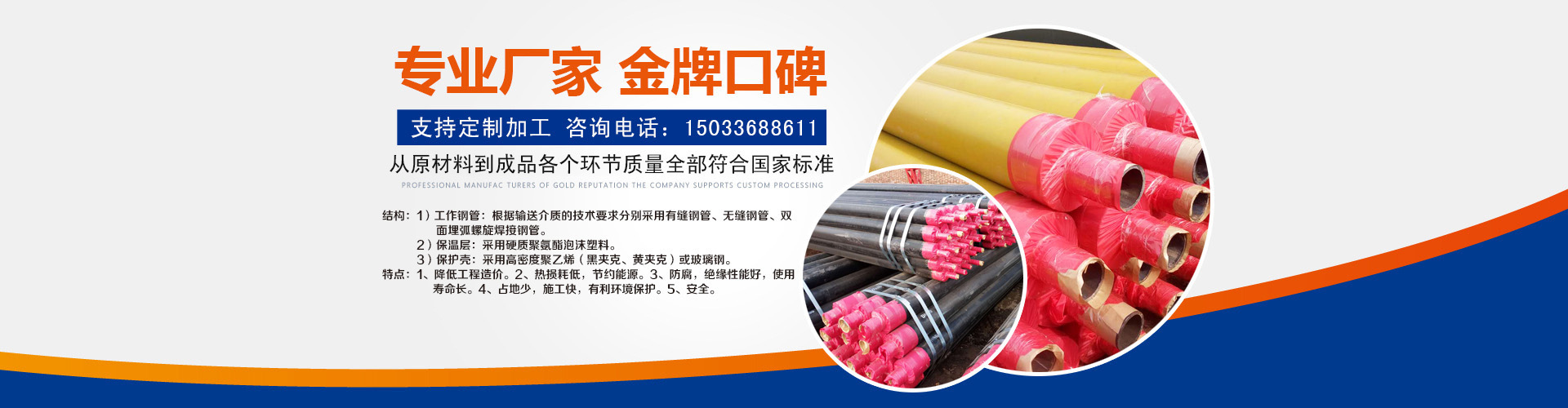 河北興松實業(yè)有限公司主營:預(yù)制直埋保溫管,鋼套鋼直埋保溫管,預(yù)制鋼套鋼保溫管,預(yù)制直埋熱水保溫管(件),預(yù)制直埋蒸汽保溫管(件),預(yù)制架空聚氨酯鍍鋅保溫管.公司自成立至今始終堅持技術(shù)領(lǐng)先、服務(wù)到位的產(chǎn)品宗旨,建立了一支由高素質(zhì)的專業(yè)技術(shù)人員和企業(yè)管理人員構(gòu)成的企業(yè)運營團隊。我公司從國內(nèi)外引進了大批先進的生產(chǎn)、檢驗設(shè)備,使企業(yè)的生產(chǎn)能力、生產(chǎn)規(guī)模、技術(shù)保障與質(zhì)量控制水平始終居于國內(nèi)同行業(yè)前列。